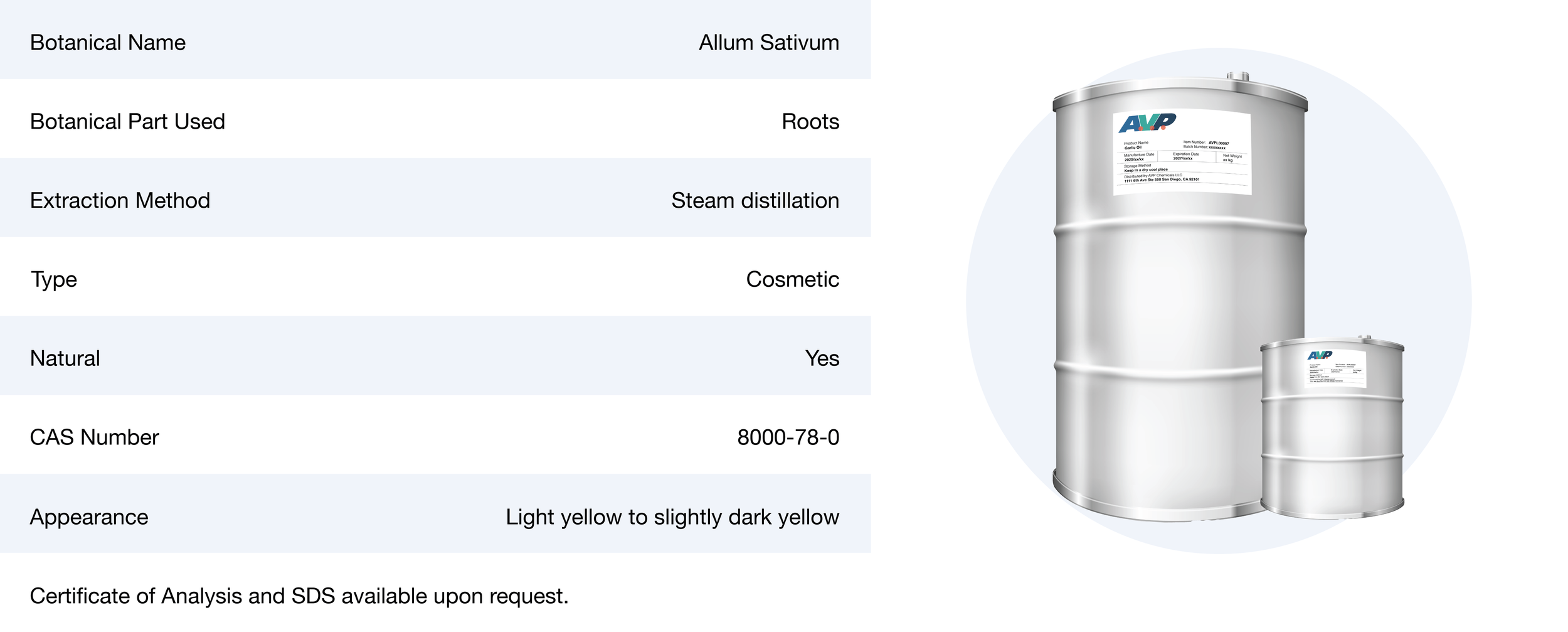 Garlic oil is prized for its robust, savory aroma and is commonly used in wellness and personal care formulations. Rich in natural compounds, it blends easily into products, offering its distinctive properties for health and aromatic applications.