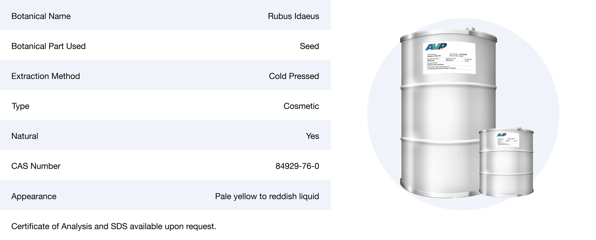 Raspberry seed oil is prized for its nourishing and antioxidant-rich properties, making it a popular choice in skincare and cosmetic formulations. Cold-pressed from raspberry seeds, it offers a lightweight texture and a subtle, natural aroma that supports healthy, radiant skin.